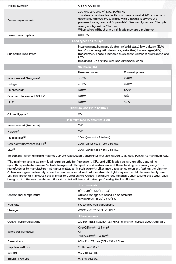 Беспроводной адаптивный регулятор освещения в европодрозетник C4-SAPD240-N