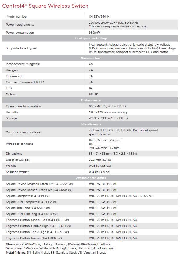 Беспроводной выключатель освещения в европодрозетник C4-SSW240-N