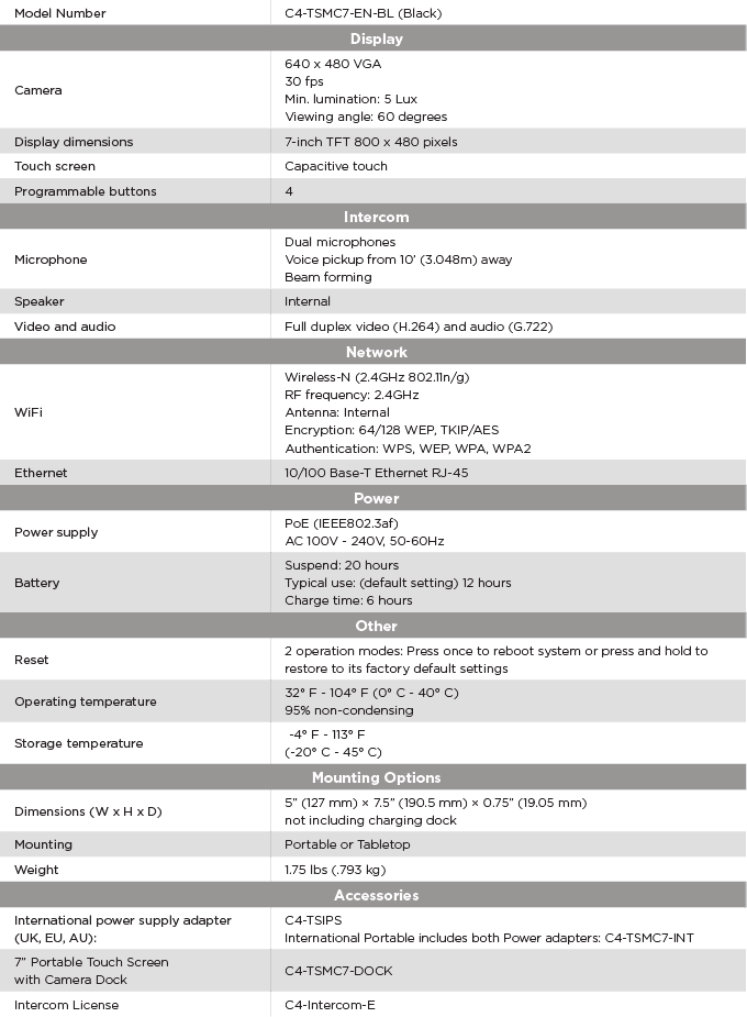 Переносная сенсорная панель управления с камерой 7" Portable Touch Screen with Camera (International) для реализации интеркома необходима лицензия C4-Intercom-E